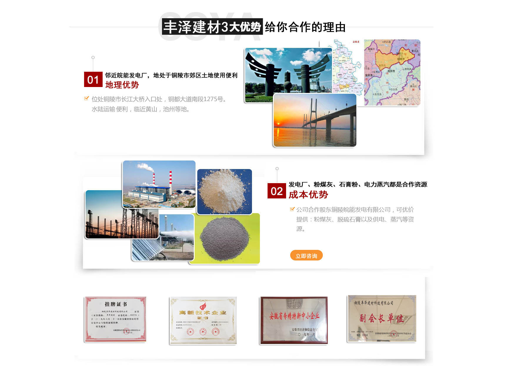 銅陵豐澤建材科技有限公司成立于2007年2月,坐落于銅都大道南段,占地4萬平方米,公司注冊資金1000萬元,現有職工百余人,是一家與皖能發電公司合作,專業從事電廠粉煤灰開發利用的高新科技企業,現擁有一條年產30萬立方米蒸壓加氣混凝土全自動生產線。 蒸壓加氣混領土(英文名Autoclaved aerated comcrete),也稱AAC,是以砂、粉煤灰等硅質材料和石灰、水泥等鈣質材料為主要原料,摻加鋁粉為發氣劑,進行生產的新型墻體材料。是我國推廣應用最早,使用最廣泛,技術最完整的輕質保溫墻體材料之一,自問世以來,始終方興未艾,備受推崇。